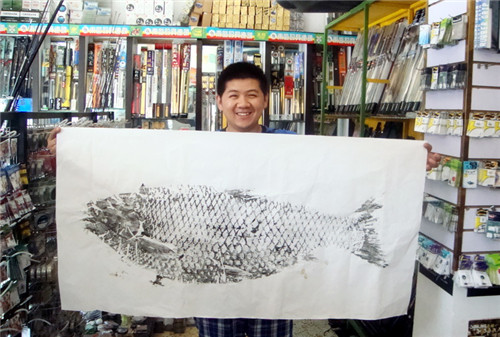 钓友阿峰在水库用矶竿钓了一条32斤的大草鱼,遛鱼过程长达40分钟,最后把草鱼擒上岸!回去以后做了一张菜鸟级别的草鱼鱼拓,以作留念!