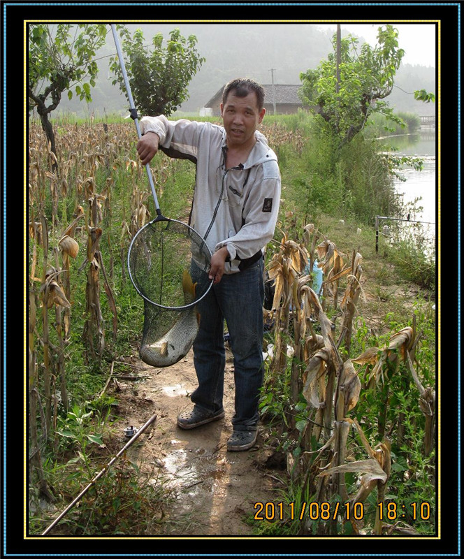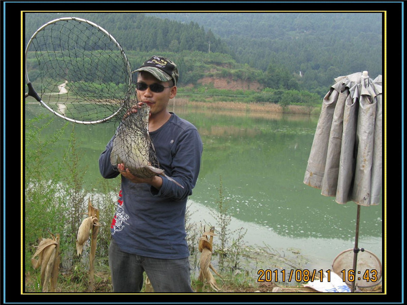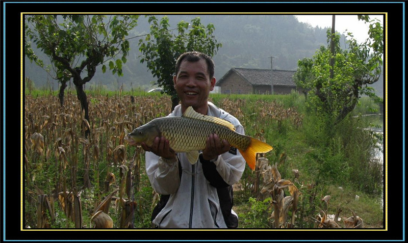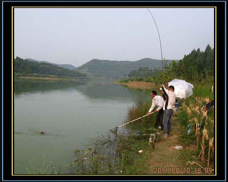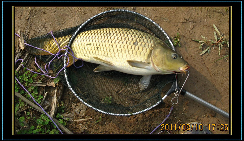 10点左右,浮标一个有力的下顿,迅速扬杆,打桩数秒,先径1.2毫米,后径10毫米只有一根香烟粗细的过江龙手杆顿时出现大满弓,我拉不动这个大物,慢慢的,大物开始游动,在我2.0主线,1.5子线,0.5千又钩的的牵引下,它并不挣扎,而是在4米深的水下不停地打转。我当时想这个大家伙可能有5-6斤吧。一分钟过去了,5分钟过去了,这个大物还在水下打转,只不过打转的范围宽些了,离水面近些了,但还是看不到这个家伙。大概这样持续了20分钟,隐隐约约看到到它了,我突然意识到,这个家伙不止5-6斤,我朝着钓友喊了起来:“可能有8-9斤”,钓友老王拿起不算太大的抄网跑过来准备帮忙。又过了几分钟大鱼被彻底牵到了水面,哇,这条鱼何止8-9斤,应该还会重些。周围的几位钓友早已停止了自己的垂钓,过来看我遛鱼,成都的一位钓友说:这条鱼大概有10斤以上。我非常认可他的估重,不敢多估,至少有10斤。当我看清楚这条大鱼时,不禁感概:好漂亮呀,金黄色的鳞甲,红色的宽尾,修长的身段,在水中翩翩起舞,它似乎并不把牵着它的线和钩放在眼里,在他的神态中看不出惊慌失措,而更像是以傲慢的神态在水中左右旋转,做自由转体的精彩表演;这时的我和这条大物比起来,那就狼狈多了,左右手臂轮流着举杆,一时左,一时右,一时站立上举,一时下蹲下送,弄的我汗流满面,双臂酸累。