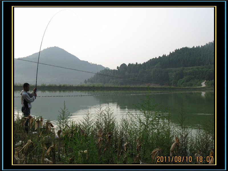 杆断了,杆尖落在了地上,我眼快手急,趴伏在地,捡起了杆尖,奇怪,线是松的,难道鱼已经跑了?我慢慢拉动鱼线,有一种鱼被牵动的感觉,我一阵惊喜,意识到鱼还在钩上,没有跑,或许它也累了,也趁机伏在水底休息一下。不过这时我傻眼了,这两节的的杆尖能遛鱼吗,显然不能呀,一旦鱼休息后恢复体力开始发力,那这条大鱼不就轻而易举逃之夭夭了吗。我突然想起了失手绳,对,一位钓友帮我解下了失手绳的一头递给了我,我急急忙忙往杆尖上栓,可能因为心太急了,怎么也栓不上,急的我额头上直冒汗,最终还是没栓好。这时成都钓友指着我放在地上5.4米的手杆大声说:把线拴在那根长杆杆上还可以再遛鱼。是呀,我咋个就没想起喃,那位成都钓友帮我解下5.4米杆的线组,把杆杆递给我,我很快就把线栓在了杆尖上。这时再慢慢牵动伏在水底的大鱼,哇,好幸运,它居然还在。我用5.4米的手杆再次牵动这条大鱼时,它又很快来到了水面。一位成都钓友说:这条鱼的脑壳上写着一个字,有人问:啥子字?他说:死字。我想,也许是吧,4.5米的杆被遛断了,鱼竟然没跑,又用5.4米的杆杆再遛,他再跑的可能性不大了吧。然而,钓鱼人在垂钓的过程中什么事都有可能发生。就在我用5.4米杆杆再次遛鱼10分钟左右的时候,鱼向我的杆杆控制范围以外的地方移动了一点,我在绷紧杆杆时感到很吃力,我正在感到不妙时,绷紧的线组突然一松。完了,完了,彻底完了。这条大物了和我玩了40多分钟后,悠然自得,大摇大摆,扬长而去了。这时我收回线组一看,两根1.5的子线整整齐齐断了。钓友们分析说:遛鱼的时间太长了,子线是被鱼嘴磨断了。